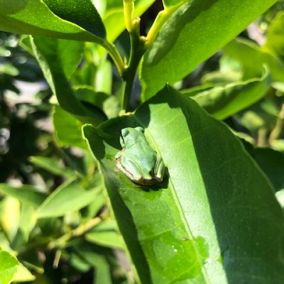 境内のライムの木でアマガエルがひなたぼっこしています。気持ちよさそうに過ごしていますね。境内には自然…