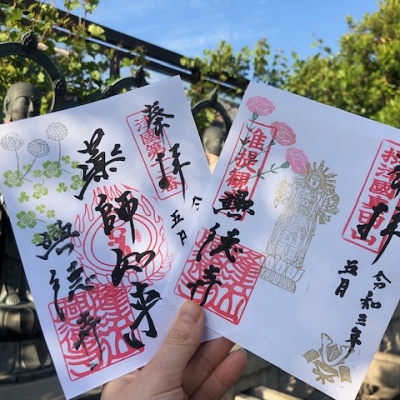 月替わりの御朱印。今月はシロツメグサとカーネーションの2種類です。准提観音様は無数の仏を生んだ母であ…
