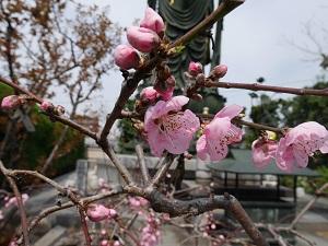 境内のももの花が見頃です。子孫繁栄を象徴とし、縁起のいい花として桃の花は親しまれています。まだ肌寒い…